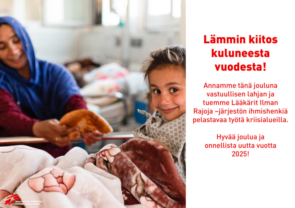 Tänä jouluna päätimme osoittaa tukemme merkitykselliseen, ihmishenkiä pelastavaan työhön. Lääkärit Ilman Rajoja on paikan päällä antamassa sairaanhoitoa miljoonille ihmisille sotien, epidemioiden ja luonnonkatastrofien keskellä, vuoden jokaisena päivänä. Yhdessä voimme auttaa.